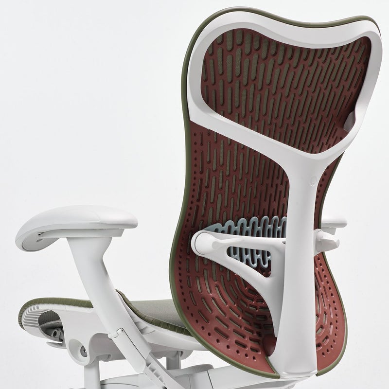 様々な体型をしっかりとサポートする背もたれ「バタフライバック」は、布地のレイヤーと葉脈のような穴の開いた成型ポリマーを組み合わせた新しい技術の開発によって生まれました。布地のレイヤーがない「トライフレックス」もバリエーションでございますが、庄文堂ではバタフライバックのモデルを展開しています。
